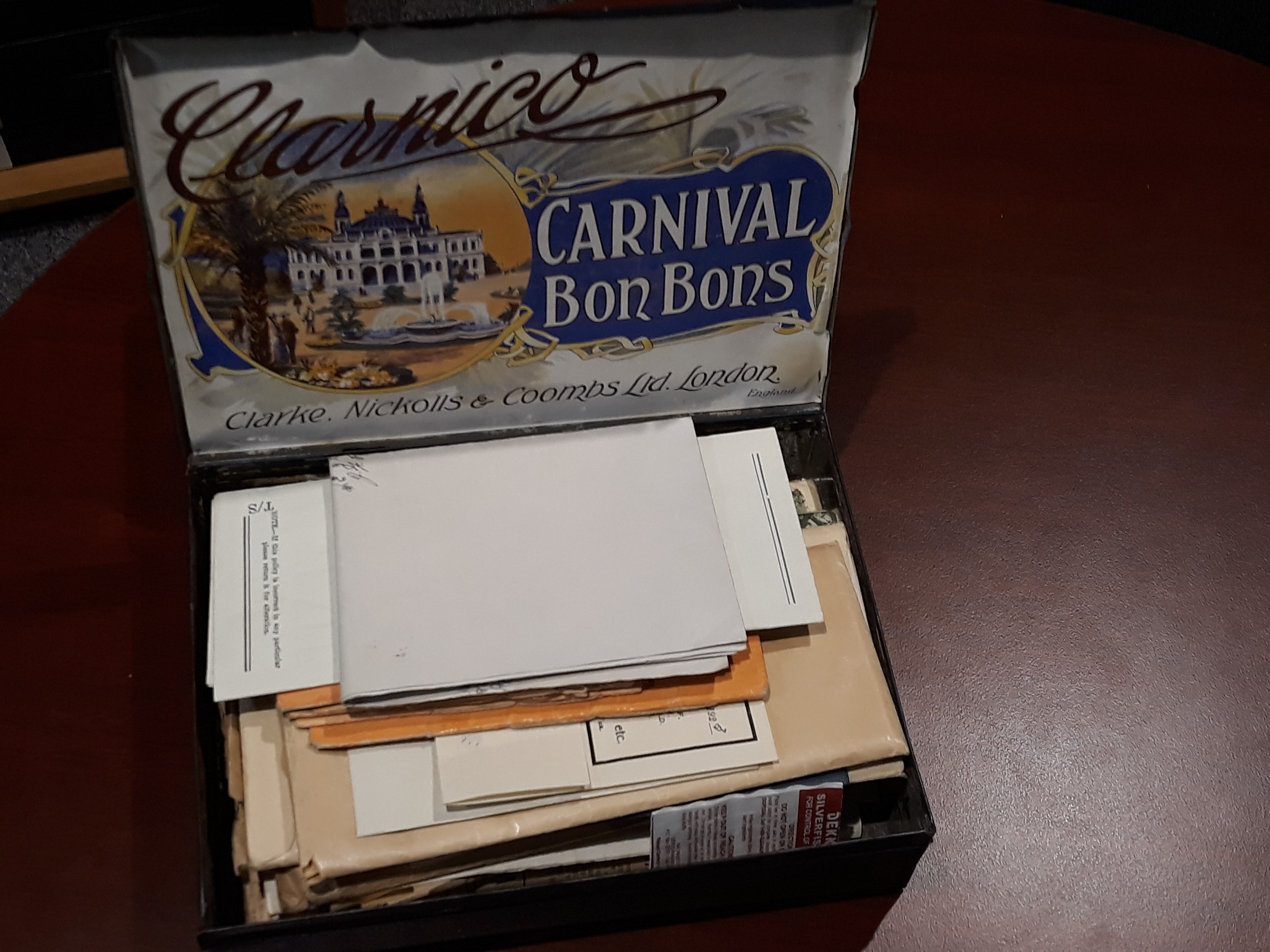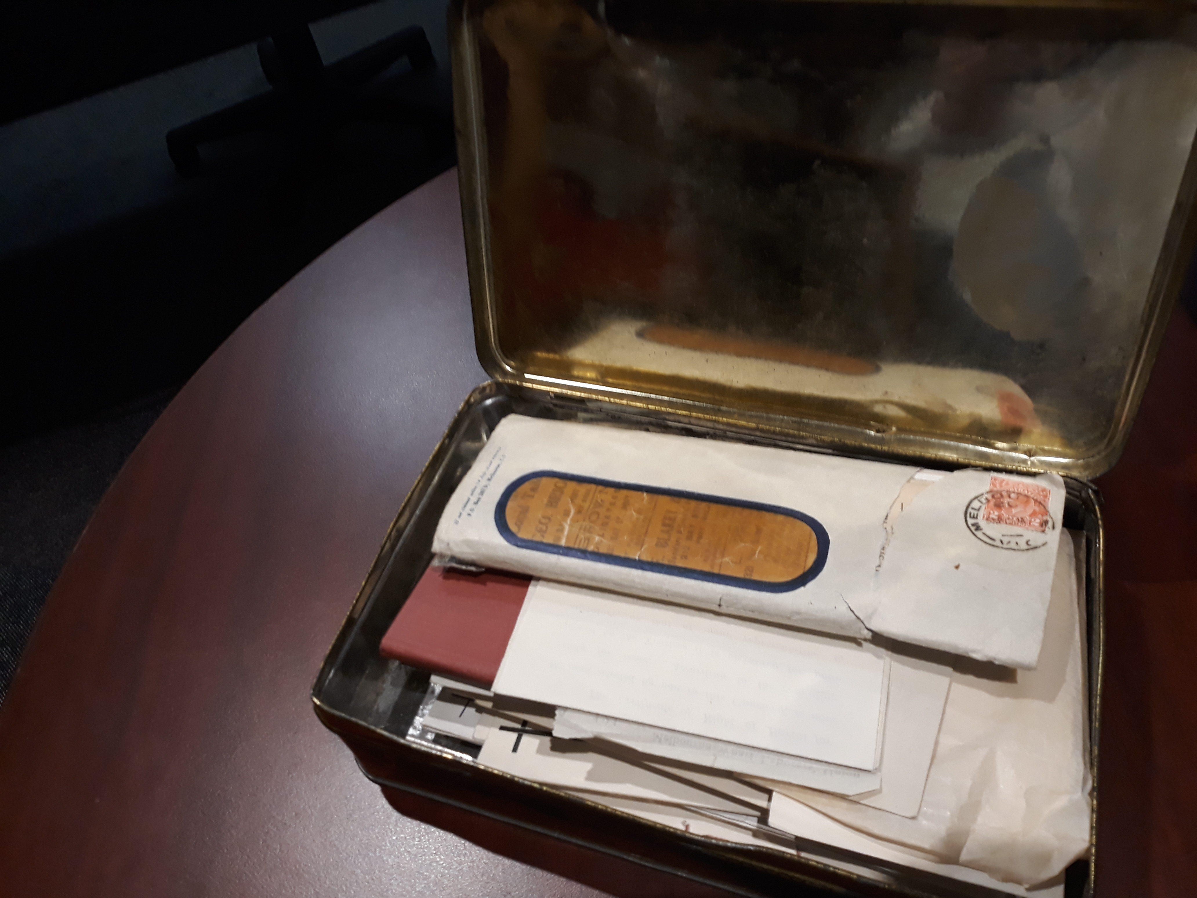 1x Small tin box. The contents of this box have been removed to ensure safe preservation of the documents. They are now located in inventory items S00000018-S00000040. The original listing of this box and its contents (in their "as found” order) is detailed below. Further information on the contents of each item can be found by going to that item’s listing. "Boy Tin Box containing: 11x Holy Trinity Messenger 1917-1944; 1x Singer Sewing Machine Receipt 1913 [to be given to the National Trust with the sewing machine]; 1x Baptismal record for John Saunders; 1x Baptismal record for Lavinia Harriet Saunders from Holy Trinity Church Port Melbourne 1923; 1x Holy Communion Book by W. Walsham How inscribed "To Elizabeth from Lily" 1953; 1x Marriage certificate of James Saunders and Elizabeth Elliott 1915; 3x Blank State Savings Bank pass book pages; Greeting cards; 1x Wedding invitation 1922; 1x Certificate of successful vaccination for Elizabeth Elliott 1895; 1x Invitation and replies for grandparents silver wedding anniversary 1941; 1x Envelope with "Mrs Taylor’s hair. Mother of Harriet Elliott"; 2x Bible cards (undated); 2x Baptismal records of John F. E. Saunders 1917 and William R. Saunders 1922; 1x The Mothers Union card (undated); 1x Church of England Boy’s Society card 1931 (with John Frederick Saunders); 1x Cover of Dr. Thomas Faulkner’s book of reproductive organs (undated); 1x "Assessment of contribution in respect of fixed property" by the Commonwealth of Australia 1942; Bereavement cards 1946; Correspondence regarding report of damage to property from the State Savings Banks 1951; Family correspondence from Devon 1886; Family correspondence from Devonshire 1889; Correspondence from the War Damage Commission regarding refunds 1942; 1x Memo from the State Savings Bank regarding housing loan 1943; Orders of service commemorating King George V 1936; 1x Bereavement card 1937; 1x Holy Trinity civic service program 1939; Correspondence regarding responses to invitation to the wedding anniversary (from Sorrento) 1941; 1x Contract of Sale amendment from State Savings Bank Victoria 1934; 1x Letter from Elizabeth’s sister Lily from Bondi Junction 1945; 1x Birthday note from Elizabeth Jane Tayler Saunders to James 4 years before they were married 1911; 1x Temperance pledge certificate of James Saunders 1929; Bereavement cards; Bible cards; 1x Melbourne City Mission anniversary flyer 1923; 1x Notice of Assessment (loan repayment) March 1943; 4x Alfred Hospital inpatient cards for James, Lavinia and Elizabeth Saunders 1933-1935; 1x Correspondence regarding mortgage extension deposits/refunds 1951; 1x Vaccination record for Elizabeth Euphemia Saunders 1926; 1x Soldiers Recreation Club flyer 1916; 2x Cemetery records for Lavinia Harriet Elliot 1925 and John Frederick Elliott 1937 from Brighton General Cemetery; 1x War damage insurance certificate 1942; 1x City of Port Melbourne rates receipt 1942; 1x Melbourne Wharf Labourers Union receipt 1926" (Winsome Adam, Accession Listing, 2017).